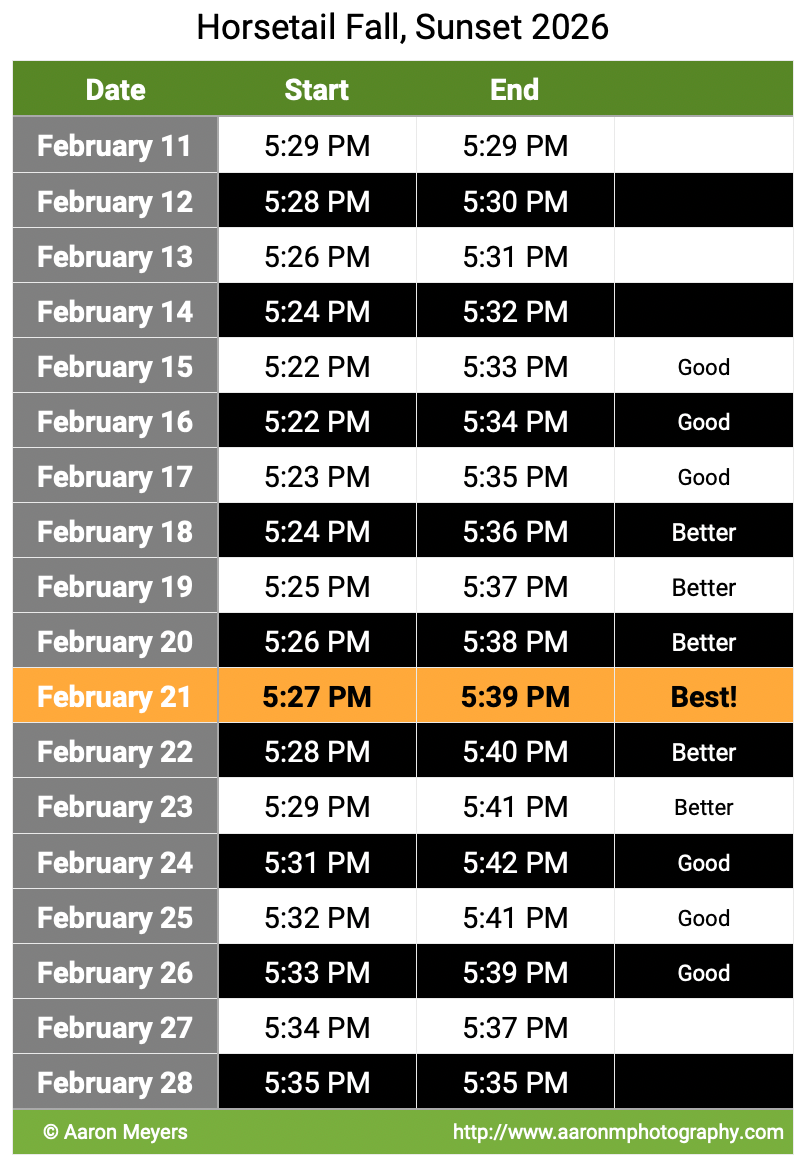 Predicted date and times for Sunset Horsetail Fall, 2026